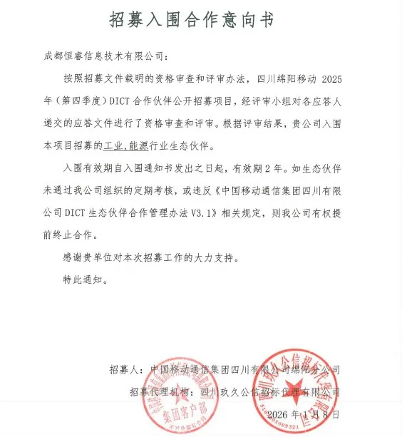 成都恒睿成功入选绵阳移动DICT合作伙伴